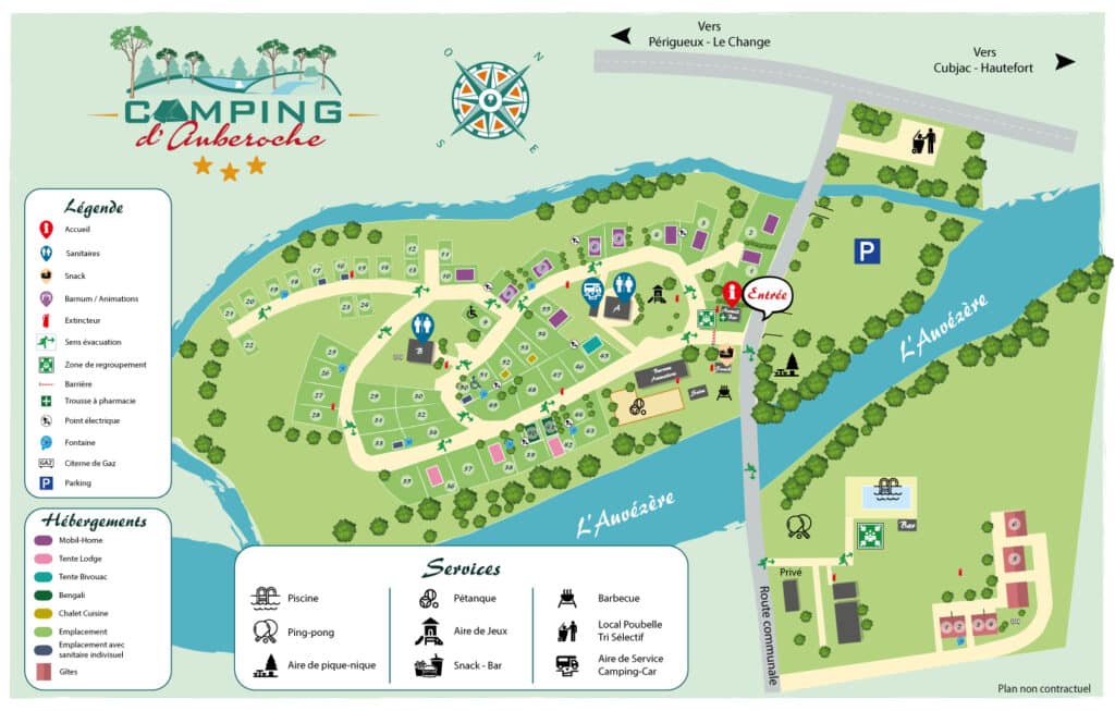 Bienvenue dans notre camping 3 étoiles, niché au cœur de la magnifique région de la Dordogne. Voici un aperçu de notre plan de camping pour vous aider à mieux vous repérer et à profiter pleinement de toutes nos installations.
