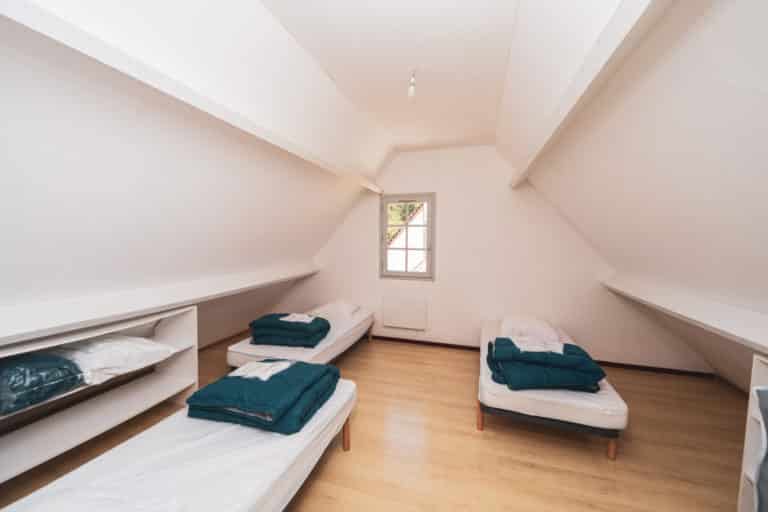 Upstairs, the Grand Gîte has two bedrooms. The first bedroom is equipped with a double bed (140×190 cm) and the second with three single beds (90 cm), with the option of joining two single beds to create a double bed. An additional folding bed is also available for added flexibility. Sheets are not provided, but comforters and pillows are included for your comfort.