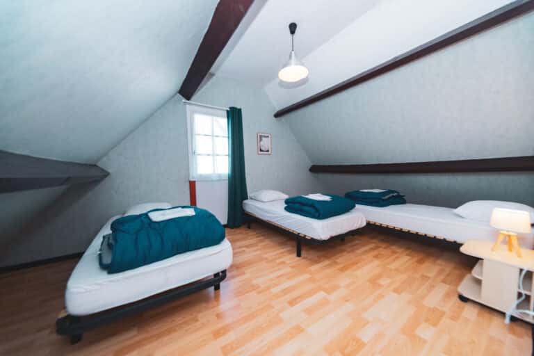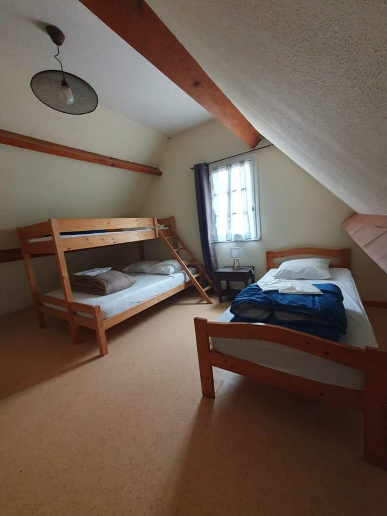 Upstairs, the layout of the bedrooms varies from gîte to gîte. Gîtes N°1 and N°2 have one bedroom with a double bed (140×190) and two single beds (90×190), while gîtes N°3 and N°4 have one bedroom with three single beds (90×190). Comforters and pillows are provided, but sheets are not.