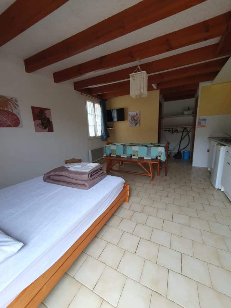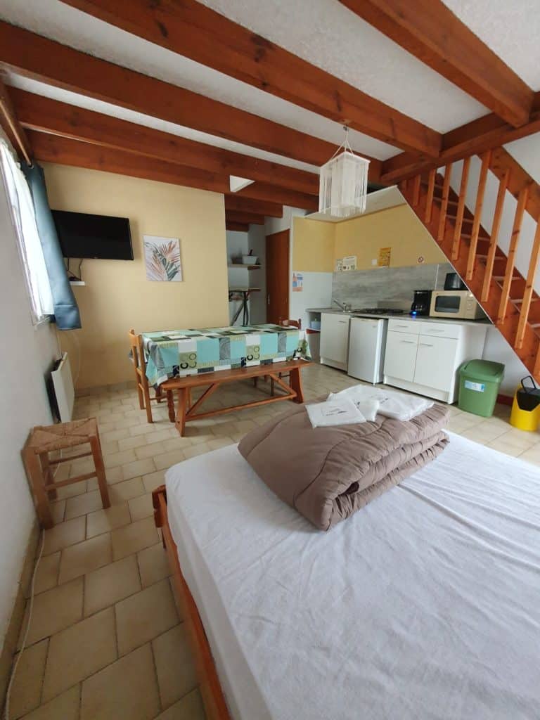 On the garden level, you’ll find a fully-equipped kitchen opening onto the dining area. The kitchen includes a sink, a fridge, a 4-burner gas hob, a microwave, a toaster, a filter coffee maker, and all the crockery and cutlery you need. The dining area is equipped with a TV for your relaxing moments. This room is also equipped with a double bed (140×190). The sanitary facilities, including a separate WC and a shower room with shower and washbasin, are located on this level. The living room opens onto a private outdoor terrace with wooden garden furniture and parasol, offering a pleasant view of the swimming pool.