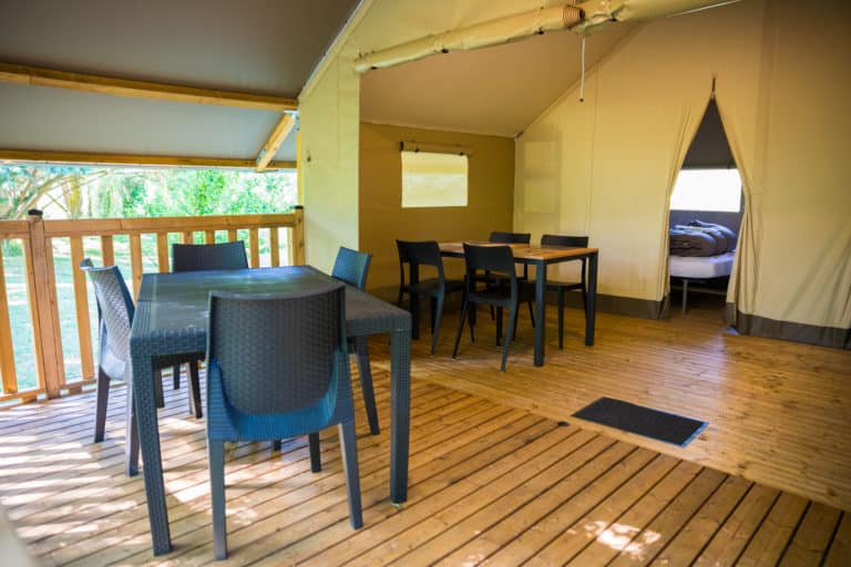 Les tentes lodges sur pilotis vous accueillent au bord de la rivière, offrant une terrasse couverte de 11 m² avec une vue panoramique sur la rivière et la campagne environnante. Vivez vos vacances au plus près de la nature tout en bénéficiant du confort moderne.