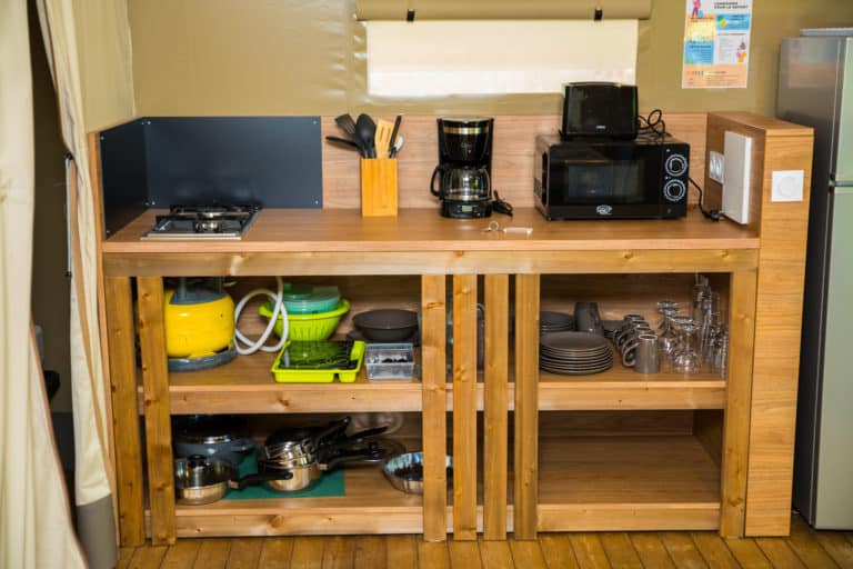 Chaque tente lodge dispose d’un coin cuisine parfaitement équipé avec :