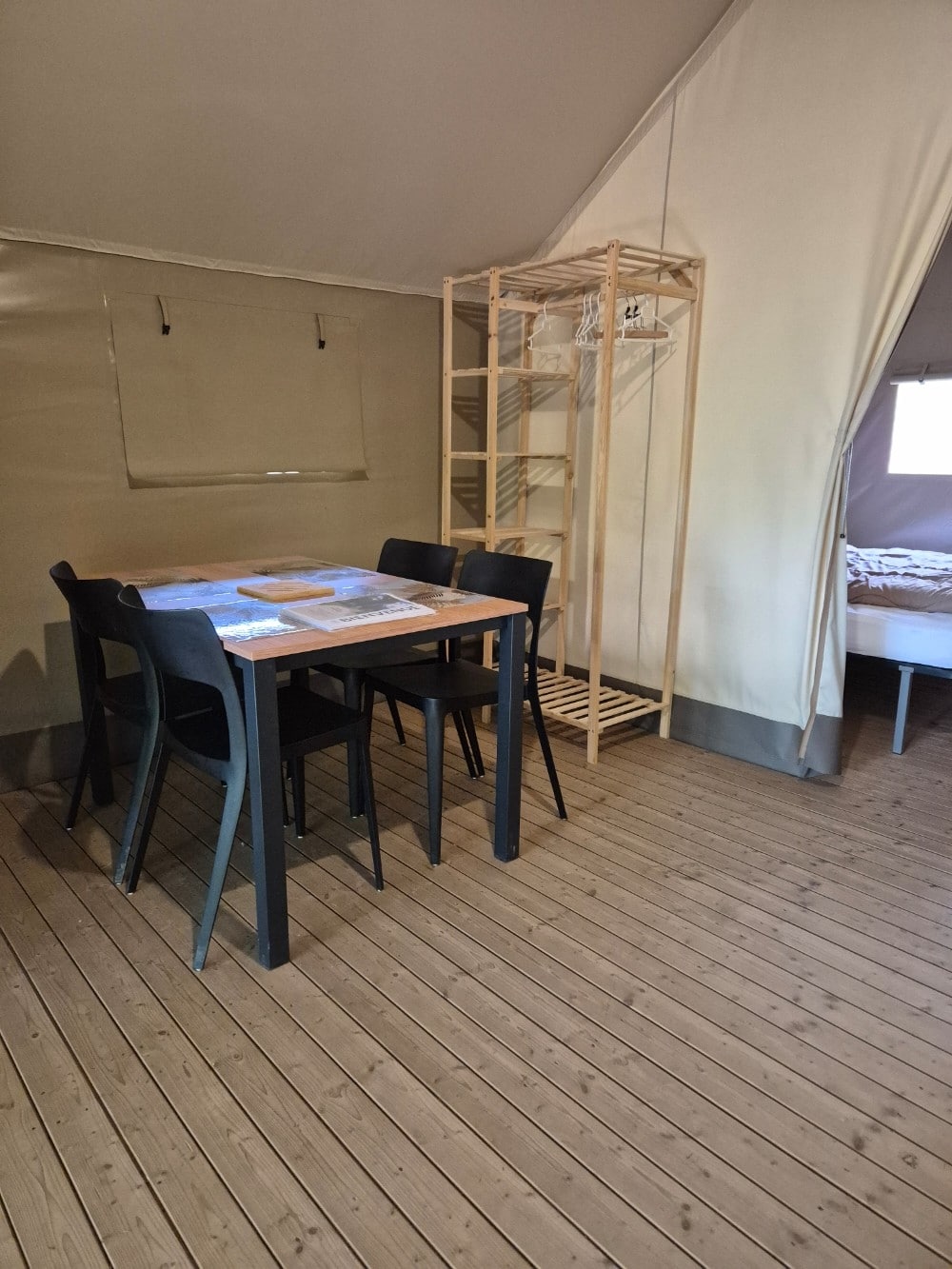 Les tentes lodges sur pilotis, situées au bord de la rivière, offrent une terrasse couverte de 11 m² avec vue panoramique. Elles disposent d’une cuisine équipée (réfrigérateur-congélateur, plaque gaz, micro-onde, cafetière, grille-pain, vaisselle) et de deux chambres séparées avec électricité. Sans sanitaires, elles offrent une expérience authentique. Profitez de deux chiliennes et d’un salon de jardin pour vous détendre. Les tentes sont respectueuses de l’environnement, intégrées harmonieusement dans la nature.