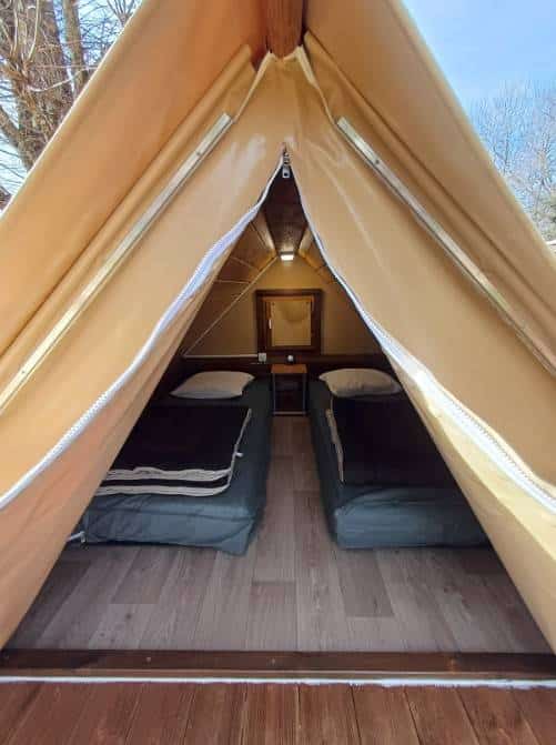 Sans sanitaires privatifs, la tente donne accès aux sanitaires communs du camping.