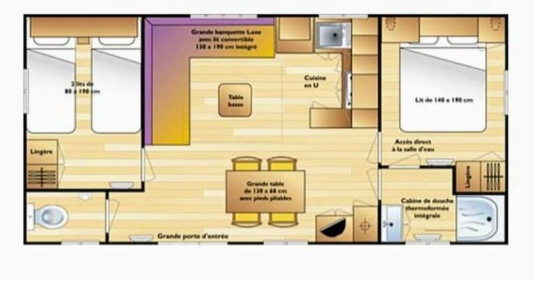 Le mobil-home IRM Super Mercure Confort dispose de deux chambres équipées de volets, l’une avec un lit double et l’autre avec deux lits simples, garantissant des nuits paisibles et confortables. Le séjour lumineux et climatisé est l’endroit idéal pour se détendre après une journée d’exploration.