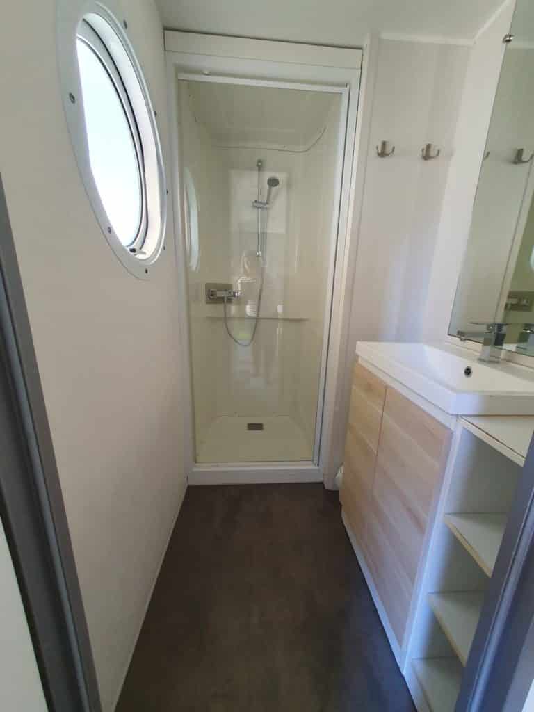 Pour votre confort, le mobil-home est équipé d’une salle d’eau moderne avec douche et lavabo, ainsi que d’un WC séparé, offrant commodité et intimité.