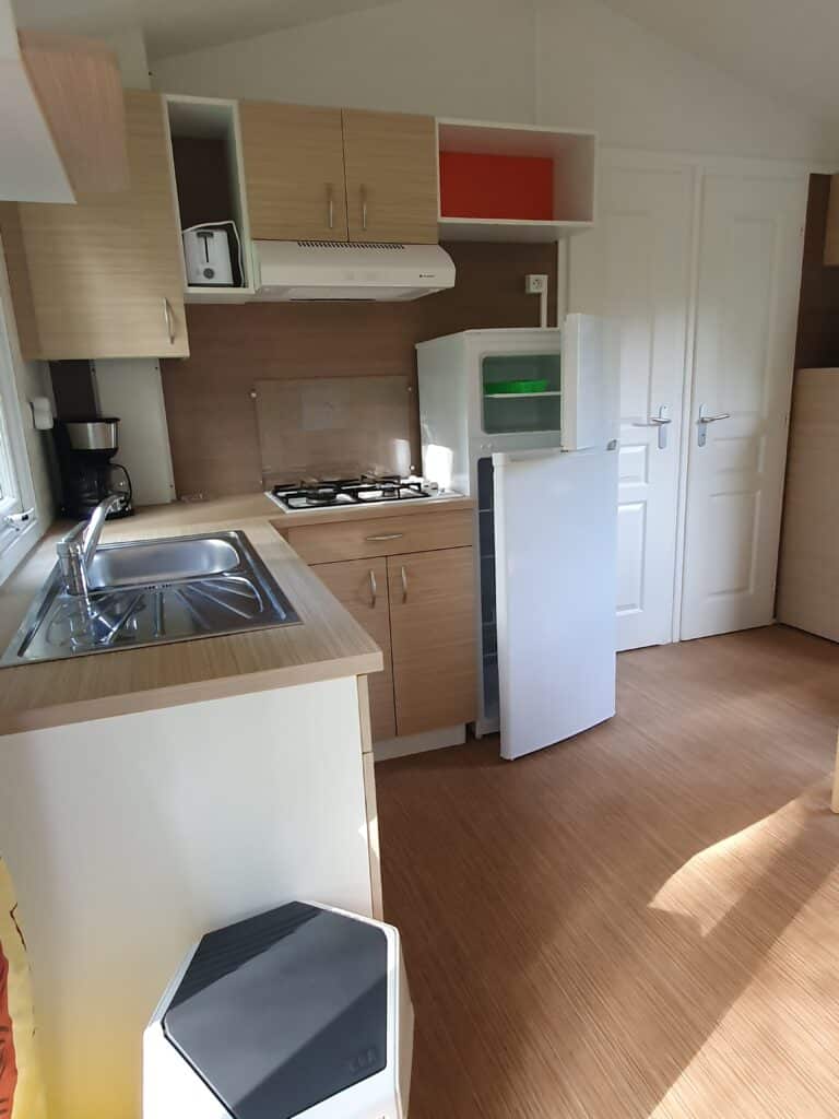 Le mobil-home est équipé d’une salle d’eau moderne avec douche et lavabo, ainsi que d’un WC séparé, pour plus de commodité et d’intimité durant votre séjour.
